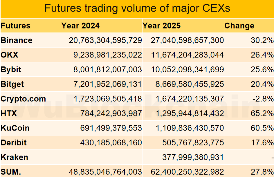 In 2025 spot trading volume rankings, Binance, Bybit, Gate, and Crypto.com took the top four positions, with Binance’s volume being nearly five times that of the second-place exchange. In derivatives trading volume, Binance, OKX, Bybit, and Bitget occupied the top four positions.