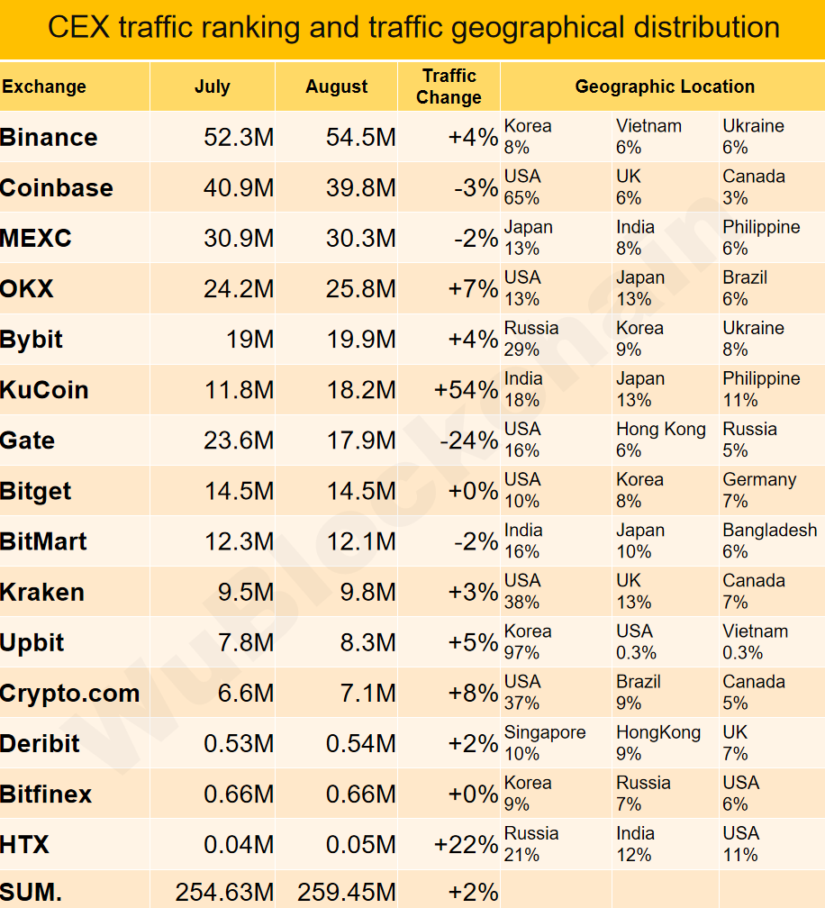 In August, the website visits of major exchanges increased by 2% compared to July. The top three in terms of change were KuCoin +54%, HTX +22%, and Crypto.com +8%. The bottom three were Gate -24%, Coinbase -3%, and MEXC -2%.