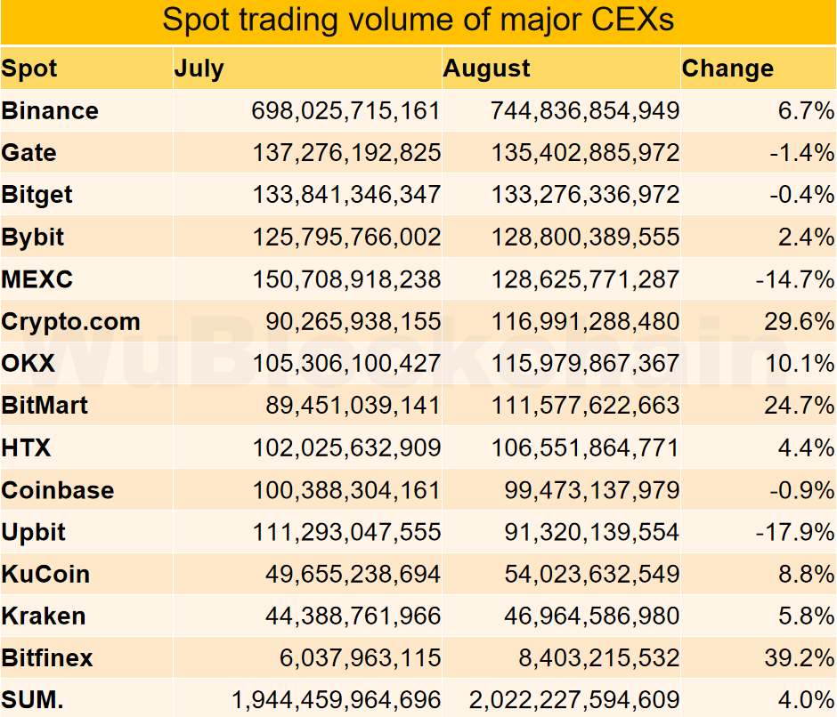 CEX Data Report in August, spot trading volume up 4%, derivatives trading volume up 14%, website visits up 2%