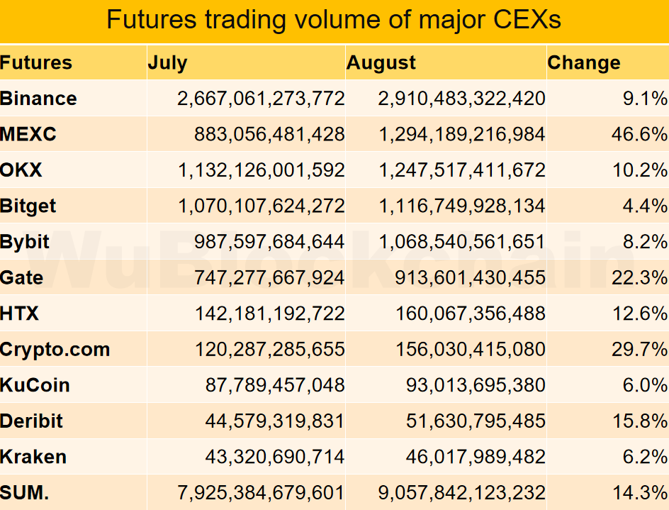 In August, the derivatives trading volume of major exchanges increased by 14% compared to July. The top three in terms of change were MEXC +47%, Crypto.com +30%, and Gate +22%. The bottom three were Bitget +4%, KuCoin +6%, and Kraken +6%.