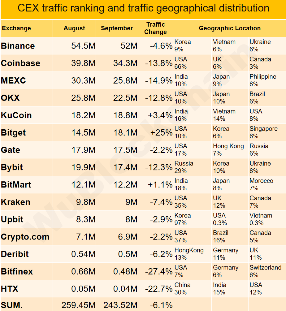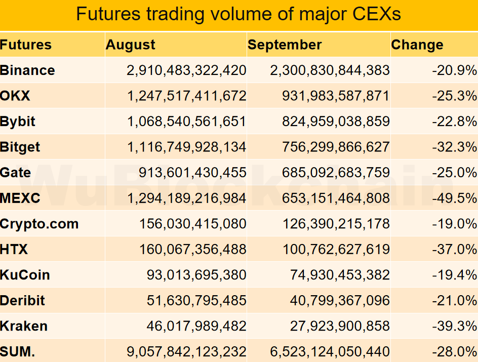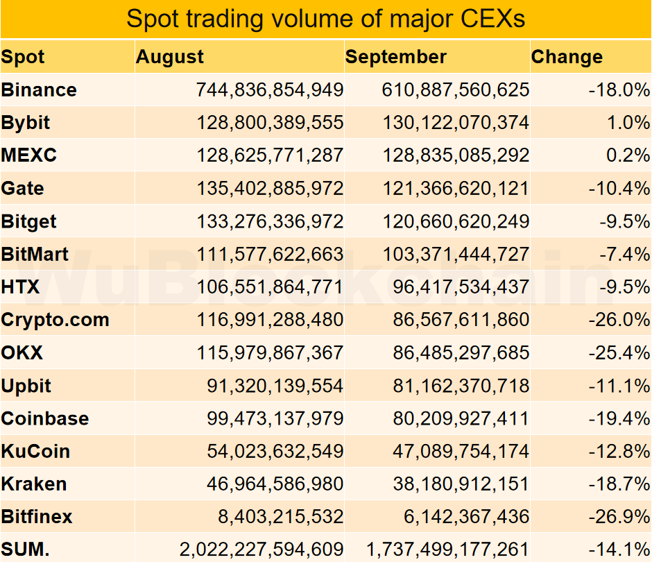 CEX Data Report in September, Spot Trading Volume Down 14%, Derivatives Trading Volume Down 28%, Website Traffic Down 6%