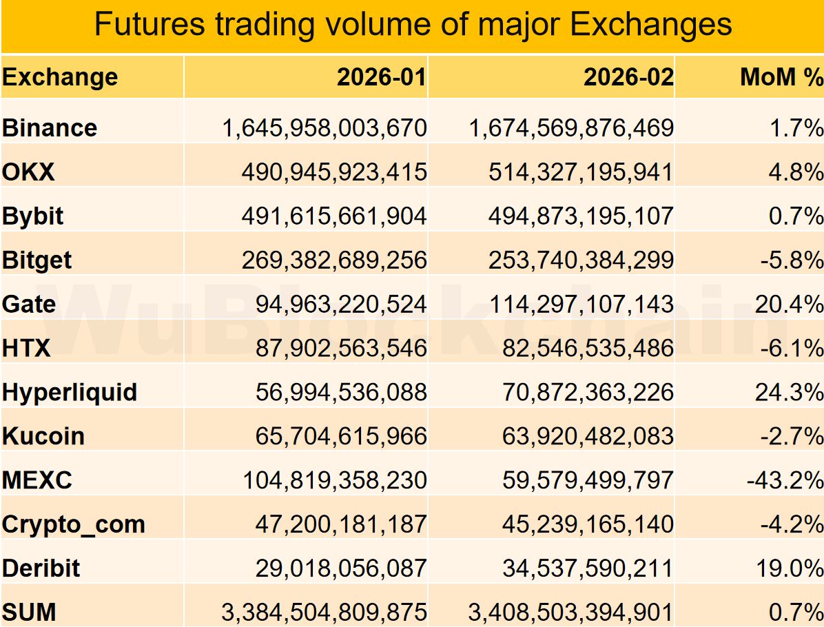 In February 2026, the derivatives trading volume of major exchanges increased by about 0.7% compared with January 2026. The top three exchanges by growth rate were Hyperliquid +24%, Gate +20%, and Deribit +19%. The bottom three were MEXC -43%, HTX -6%, and Bitget -6%.