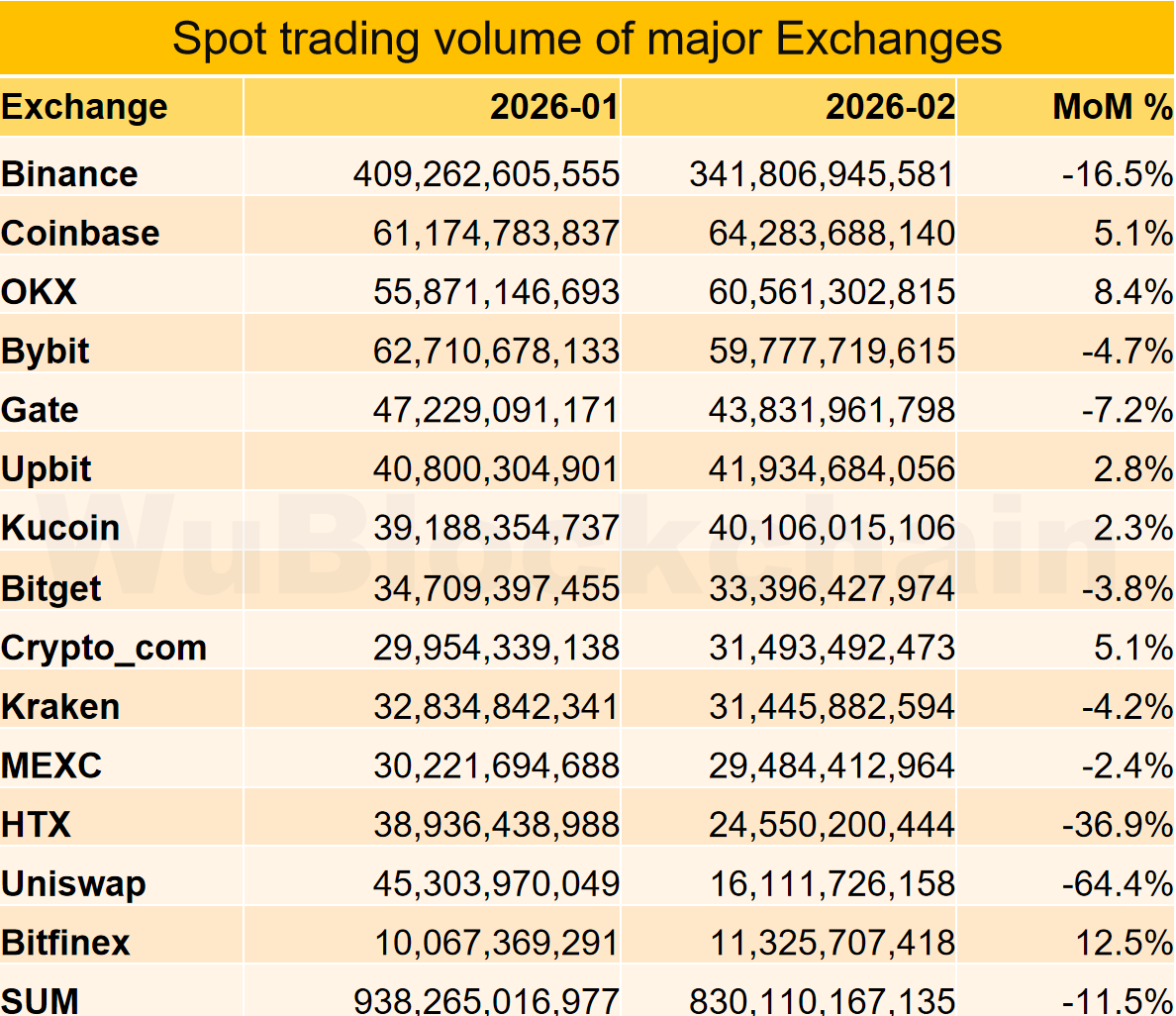 In February 2026, the spot trading volume of major exchanges decreased by about 11.5% compared with January 2026. The top three exchanges by growth rate were Bitfinex +12.5%, OKX +8.4%, and Coinbase +5.1%. The bottom three were Uniswap -64%, HTX -37%, and Binance -16%.