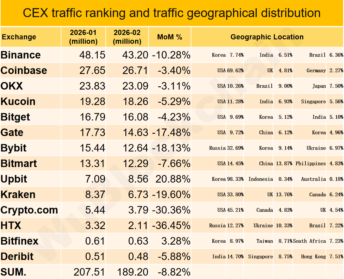 In February 2026, the website traffic of major exchanges decreased by about 8.8% compared with January 2026. The top three exchanges by rate of change were Upbit +21%, Bitfinex +3%, and OKX -3%. The bottom three were HTX -36%, Crypto.com -30%, and Kraken -20%.