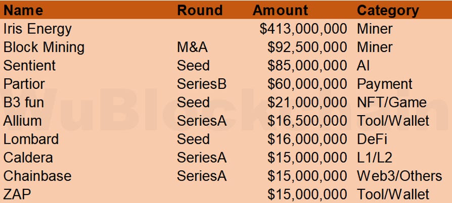 The total fundraising amount in July was $1.02 billion, an increase of 37.8% month-on-month ($740 million in June 2024) and an increase of 85.5% year-on-year ($550 million in July 2023). The top 10 fundraising rounds by amount are as follows: